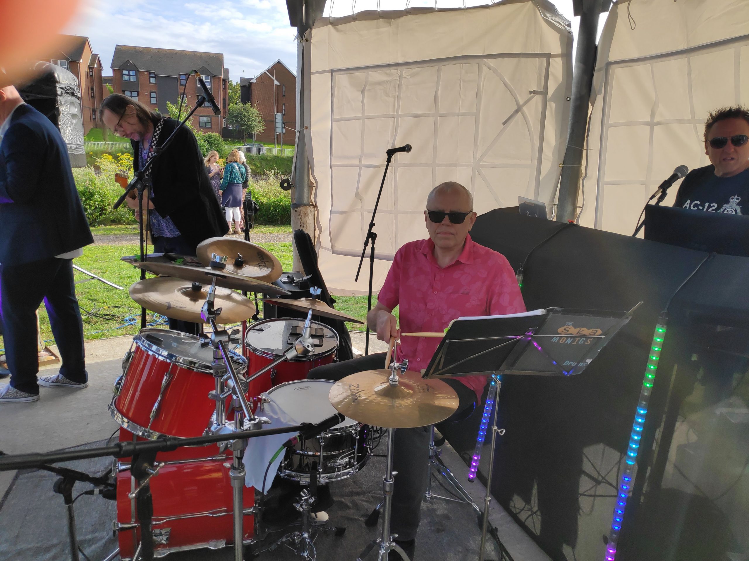 The photo shows the set up – a dance floor on the grass and a platform for the drums and vocals.